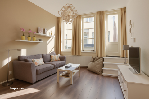 Beletage: entree via hardstenen trap, overdekt portaal met entree, grote hal met schuifkast (garderobe en meterkast), riant trappenhuis met antiek Delftsblauw toilet en fontein (monumentaal). Riante woonkamer met een gashaard, mooi hoog plafond en grote ramen met zicht op de gracht en de grote kerk. Semi-open keuken met L-vormig granieten aanrechtblad en inbouwapparatuur, leistenen vloer.